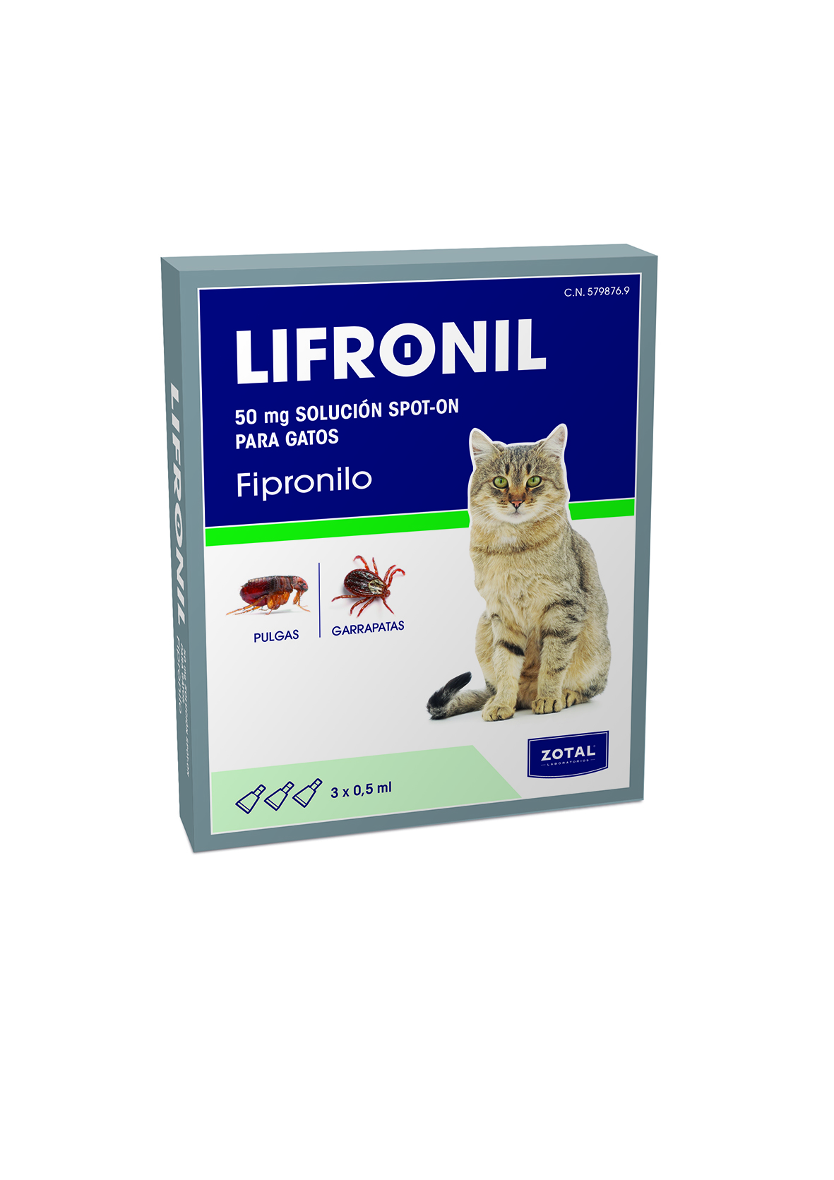 Modo de administración: Extraer la pipeta del sobre. Sujetar la pipeta en posición vertical. Dar golpecitos en la parte estrecha de la pipeta para asegurar que su contenido se encuentra en el cuerpo principal. Retirar la punta de la pipeta. Separar el pelaje del animal hasta que la piel quede visible. Colocar la punta de la pipeta directamente sobre la piel descubierta del animal y apretarla ligeramente para vaciar su contenido en dos puntos a lo largo del lomo del gato, con preferencia en la base de la cabeza y 2 ó 3 cm más atrás, vaciando aproximadamente la mitad del volumen en cada punto. Apretar la pipeta varias veces para asegurar que la administración se ha realizado completamente. Es importante asegurarse de que el medicamento veterinario se aplica en una zona en la que el animal no pueda lamerse y que los animales no se laman unos a otros después del tratamiento. Debe procurarse no humedecer en exceso el pelo del animal con el medicamento ya que esto podría darle un aspecto pegajoso al pelaje en la zona de tratamiento. No obstante, si esto ocurriera, desaparecería a las 24 horas después de la aplicación. También se puede observar en el pelaje de esa zona la aparición de descamación y depósitos cristalinos durante las 48 horas siguientes a la aplicación.